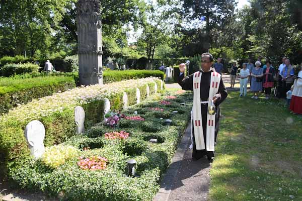 Die Segnung des Gemeinschaftsgrabes auf dem Friedhof Weiler übernahm Pfarrvikar Edward Balagon, da der Pfarrer zu einer häuslichen Taufe musste. Es folgten das Vaterunser und das „Gegrüßet seist du, Maria“.