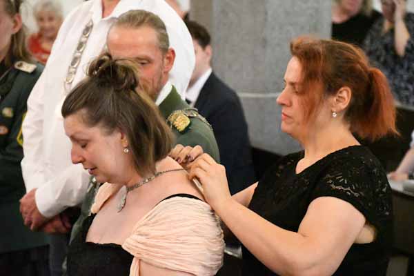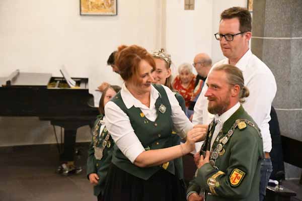 Die Übergabe die Königinnenkette der Bruderschaft durch die vorherige Königin Vanessa Spalluto an die Ehefrau Andrea des Schützenkönigs lief sehr emotional ab – samt Umarmung. Die neue Königin erhielt noch das Diadem durch die Brudermeisterin.